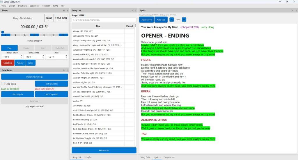 Das war ein großer Vorteil, als wir mit dem Umstieg auf digitale Musikfiles endlose Pattern-Loops setzen konnten. Kein manueller, holpriger Musik-Reset mit dem Remote-Knopf. Allerdings ist das Setzen der Loop-Sprungpunkte schon mitunter knifflig und zeitaufwendig. Mit dem neuen Callers Caddy geht das jetzt 1000fach einfacher. 1. Zuerst setzt du ganz grob im Lied deine Sprungmarken